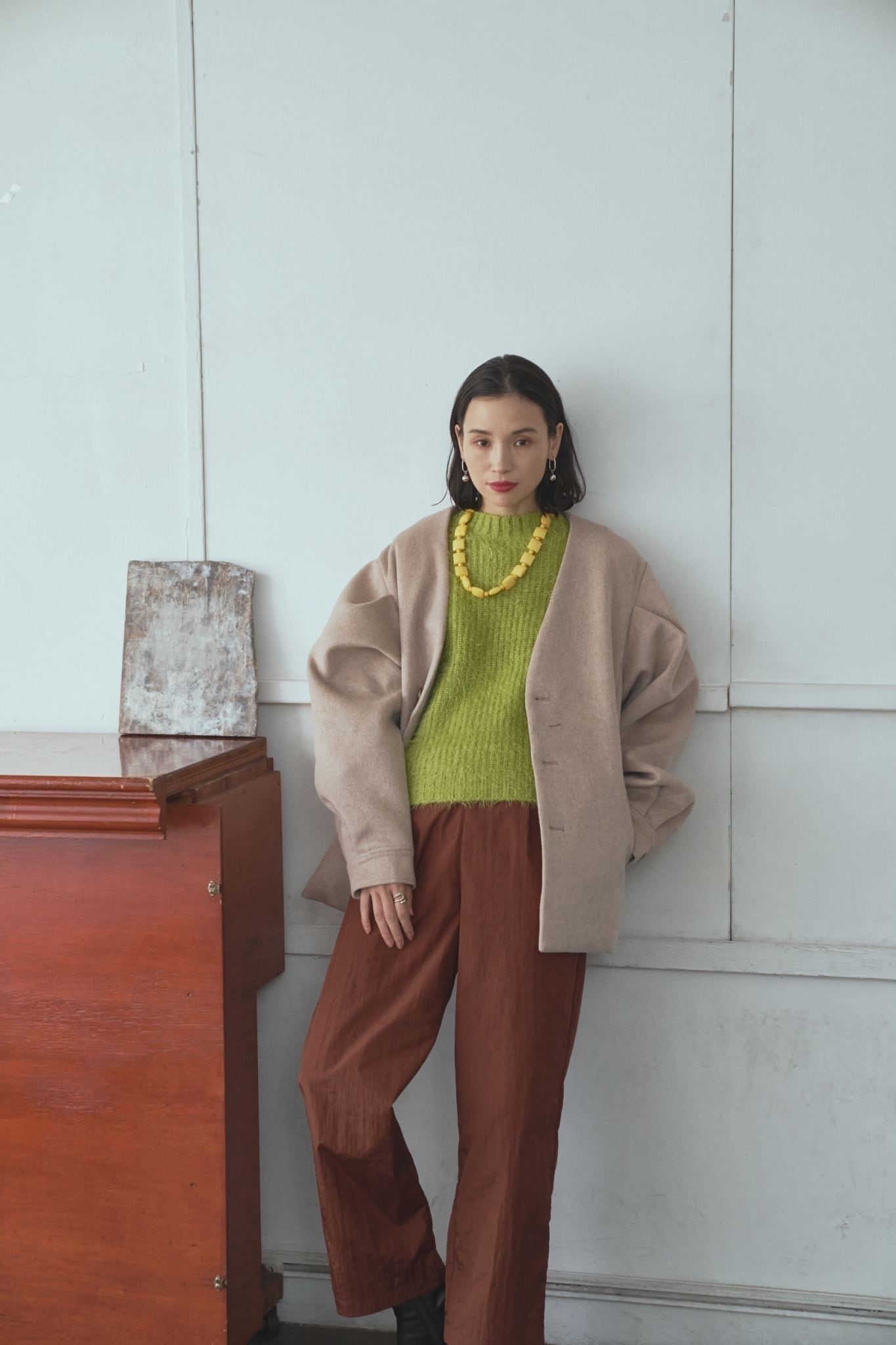 ボトムはパンツ(デニム)、カラーパンツ、サテンパンツ、細身のスカート、細身のワンピースの上にレイヤードするなど、幅広い着こなしができます。