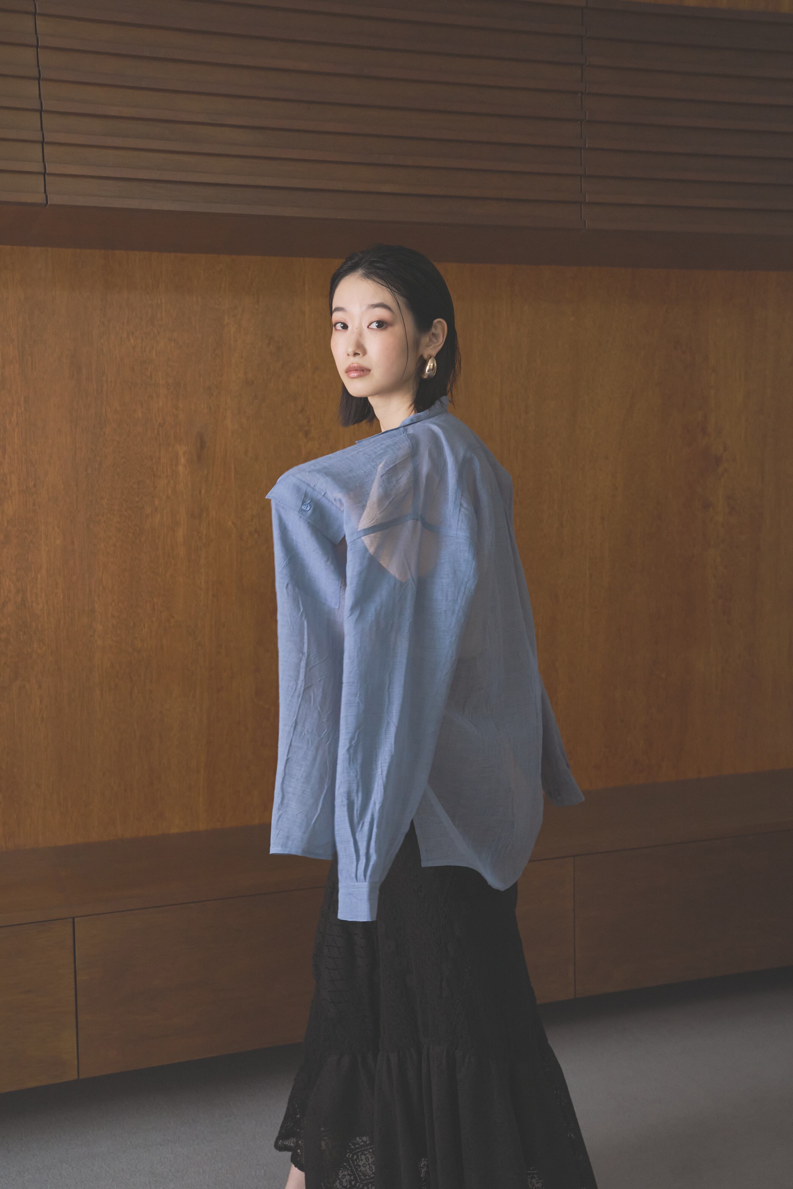 シンプルなデザインでありながら、シャリみのあるリネンを思わせる、上品なシアー感がリッチな印象のシャツ。