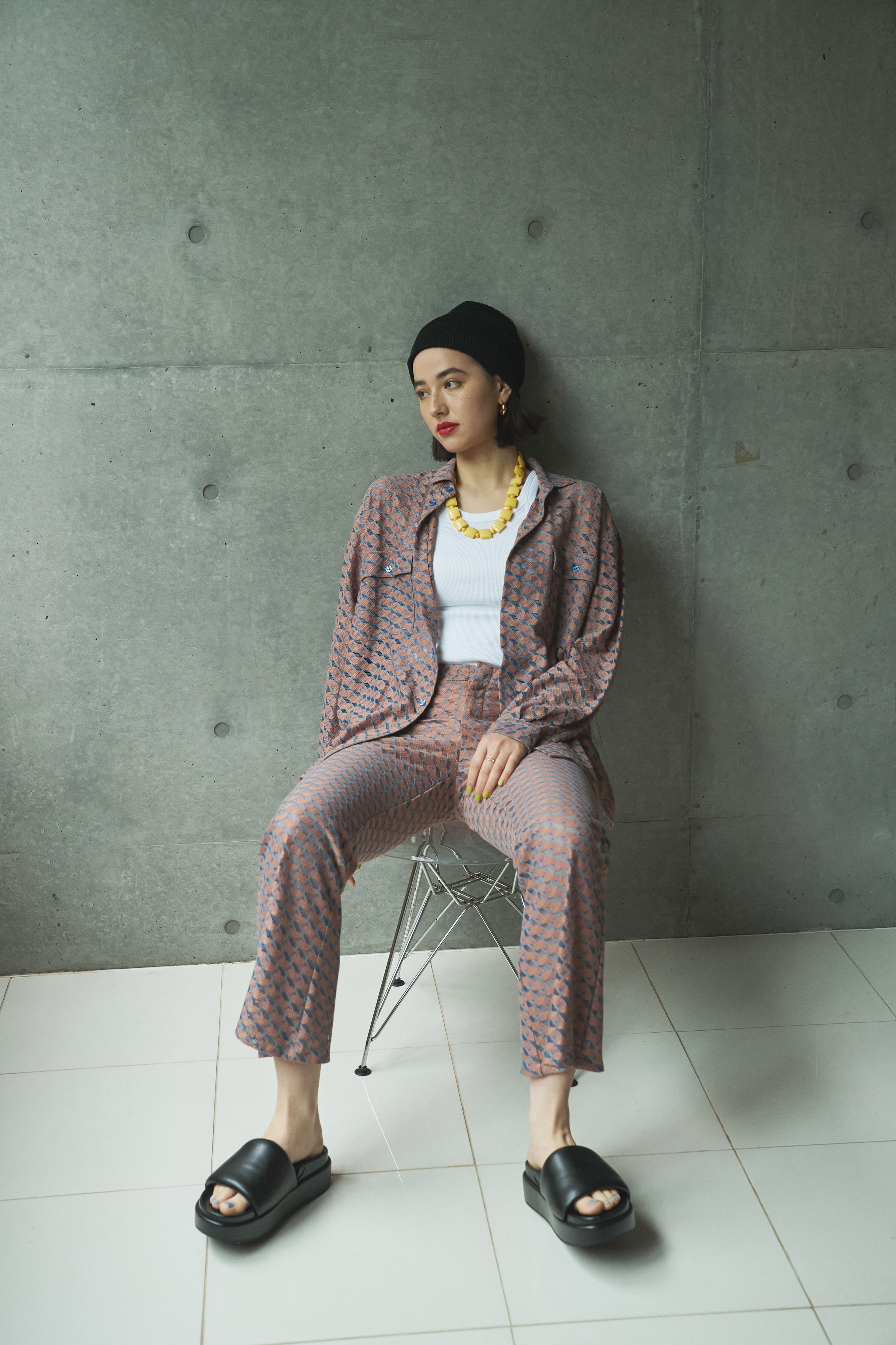 長めの丈とゆとりあるサイズ感でありながら計算されたパターンによりスッキリしたとした印象。